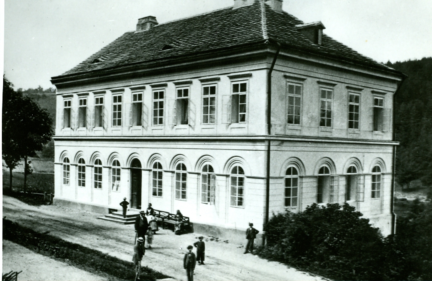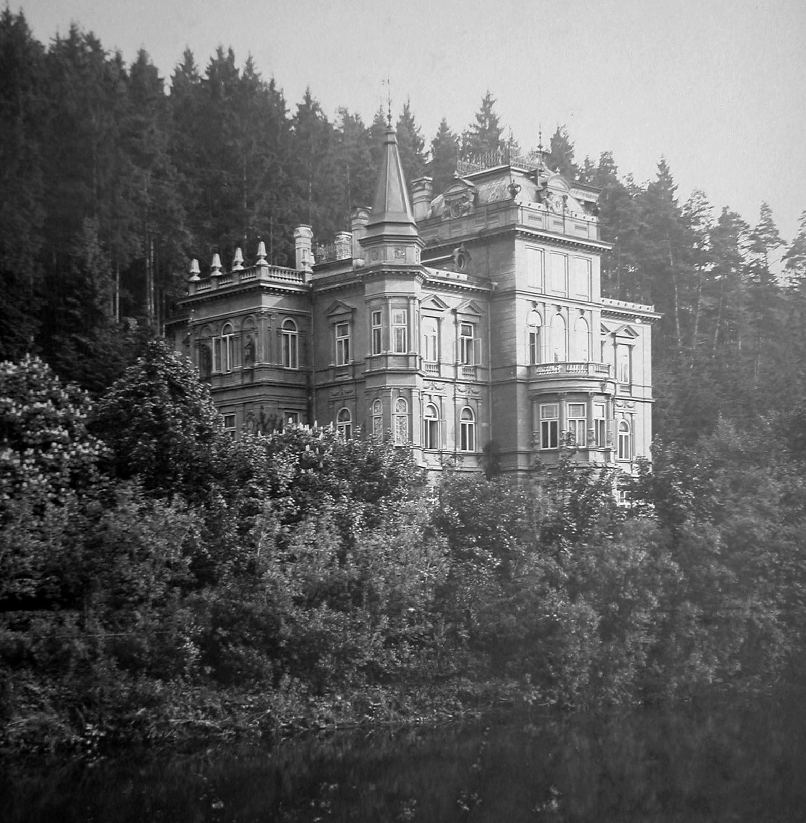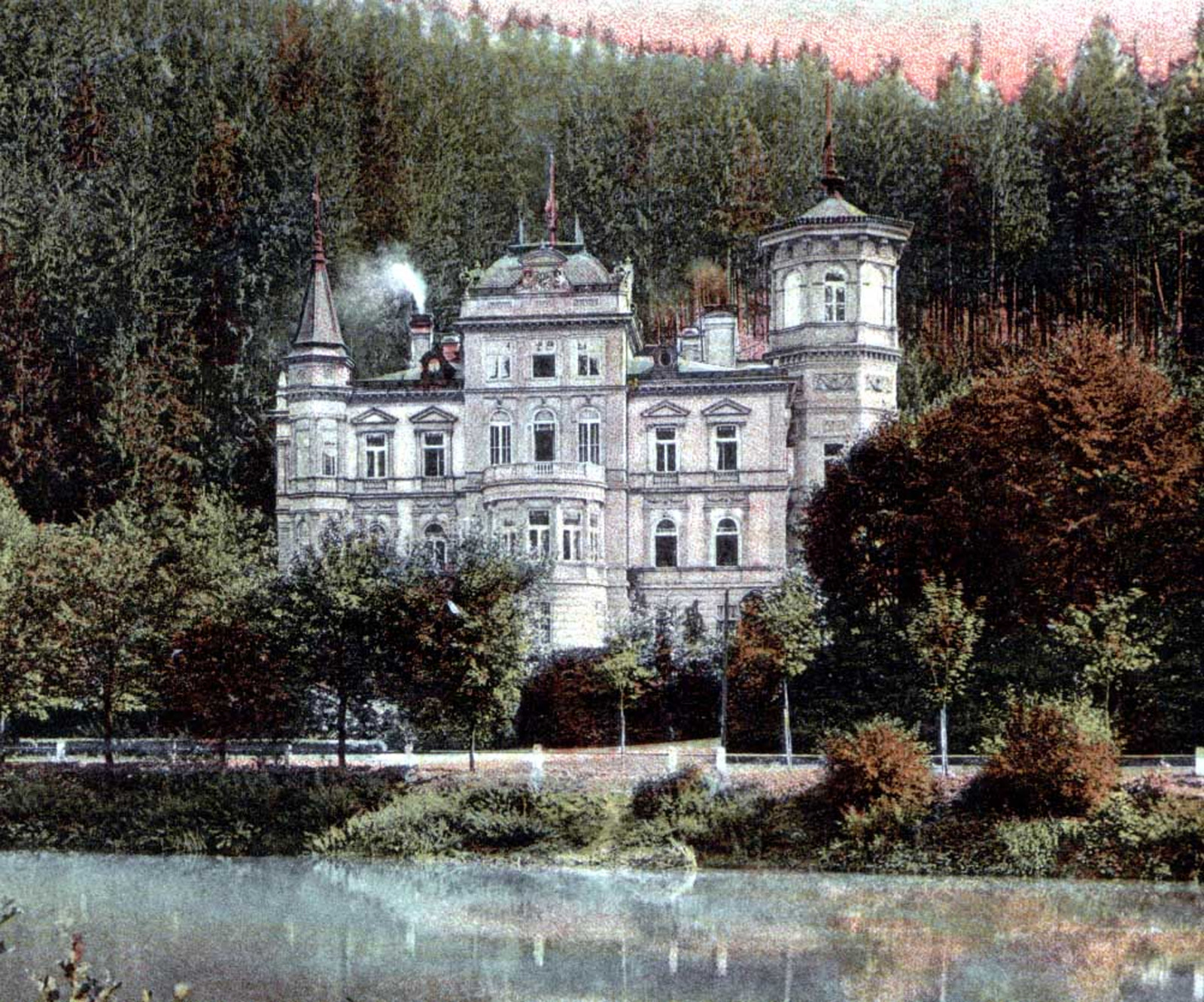 Na místě Mattoniho vily byl původně postaven zřejmě v roce 1829 panský Lázeňský dům, Zámeček. Jednalo se o třípodlažní budovu na obdélném půdorysu, zastřešenou valbovou střechou. Poté, co prameny i lázně získal Heinrich Mattoni, upravil také Zámeček. K jihozápadnímu štítu byla mezi lety 1881-1883 přistavěna hranolová věž s mansardovou střechou. V letech 1885-1886 provedl Heinrich Mattoni radikální přestavbu objektu, patrně podle projektu ateliéru Fellner & Helmer. Hmota původního Zámečku zůstala zachována včetně celkové vnitřní dispozice a přístavbami na severozápadní straně směrem k řece a k severnímu štítu byla celkově rozšířena. Podoba ve formách klasické italské novorenesance dodala objektu majestátní reprezentační ráz. Italizující charakter stavby zvýraznila navíc asymetricky umístěná polygonální schodišťová věž, doplněná v roce 1892 podle návrhu architekta Karla Haybäcka. Objekt se od té doby nazýval „Mattoniho zámek“ („Mattonische schloss“). Přilehlý prostor západně od vily byl upraven v přírodně krajinářském pojetí s romanticky pojímanými akcenty v podobě dramatických skalních výchozů a mohutných kyklopských tarasů. V centru parku byl vybudován i velký vodotrysk na způsob karlovarského Vřídla, již z dálky viditelný. V roce 1929 byl objekt upraven na Zámecký hotel („Schlosshotel“).